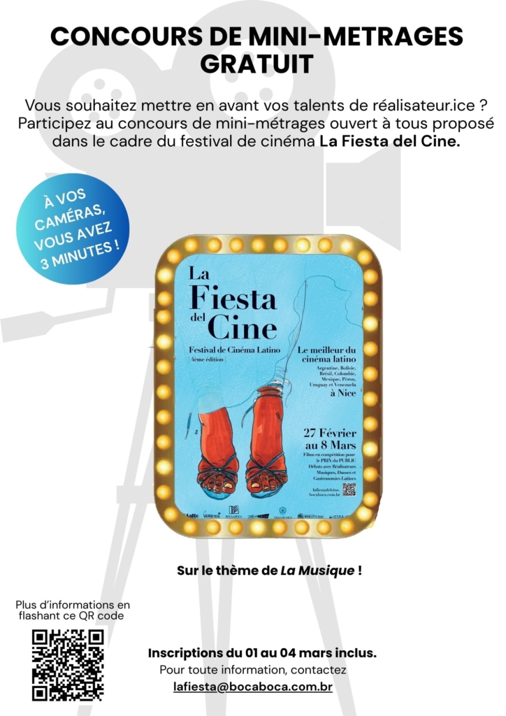 Article 1 : Organisateurs Le Festival La Fiesta del Cine – 4éme édition (27 février au 08 mars 2026) organise un concours de mini-métrages à destination d’amateurs et/ou professionnels à partir de 16 ans. Ce concours est gratuit. Les films devront être envoyés par le site à la page INSCRIPTION avant le 04 mars 2026 inclus, 18h.
